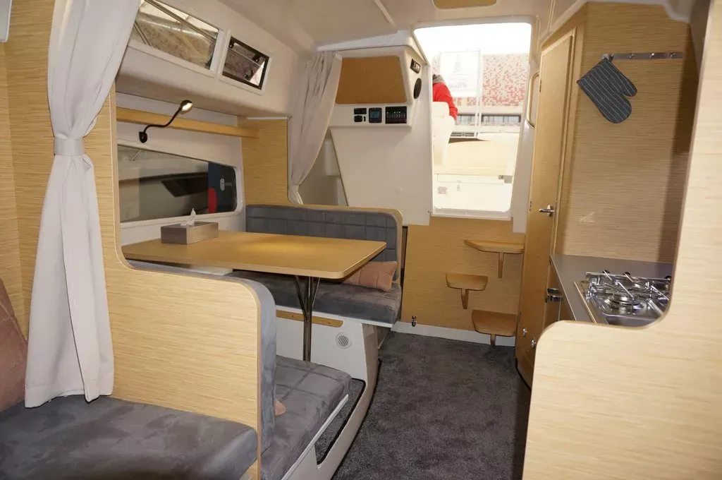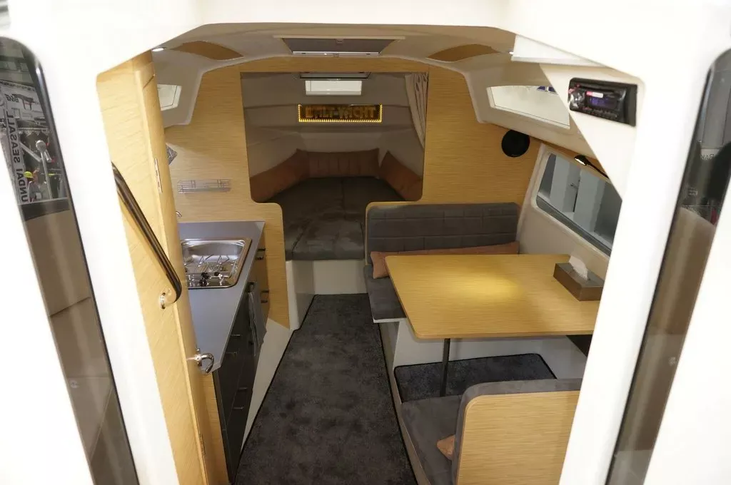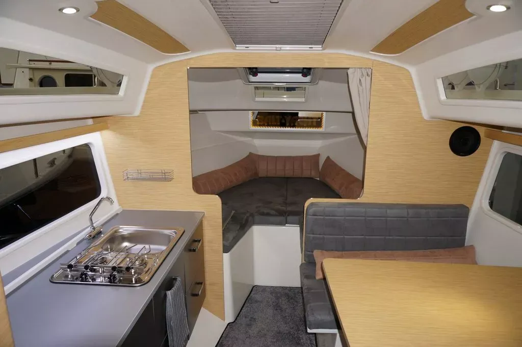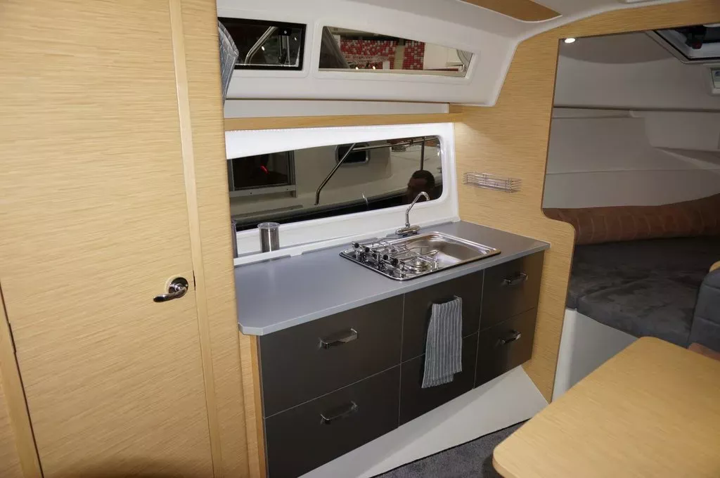 nagy konyhának és praktikus fürdőnek is jutott hely egy alig 8,5 méteres hajón. A belső tér tágas, panorámaablakokkal, álló magasság biztosított a szalonban. A manőverezést könnyíti a nyitott, jó kilátású kormányállás a kokpit területén. Konyha (galley) opcionálisan hűtővel, gáz- vagy elektromos főzőlappal, tárolókkal.