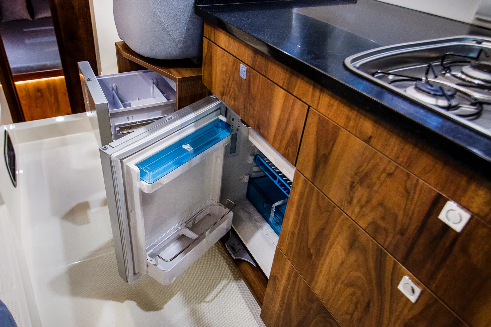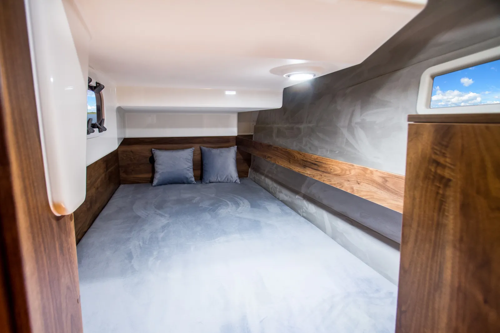 A fedélzet alatt két kényelmes, zárható kabin található. Ezek teljes belmagassággal rendelkeznek, szekrényekkel és kényelmes, teljes méretű fekhelyekkel vannak felszerelve. A fürdő világos, ergonomikus, tágas, és minden szükséges berendezéssel felszerelt: WC, mosdó, zuhany, fűtés és szellőztetés.
